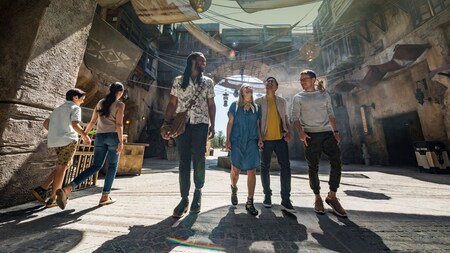 Gather near the Millennium Falcon to embark on a storytelling adventure across the galaxy. Stunning projection effects transform the spires of Batuu, evoking memories of some of the greatest moments in galactic history, as an iconic musical score draws you into the remarkable story of the Skywalkers.