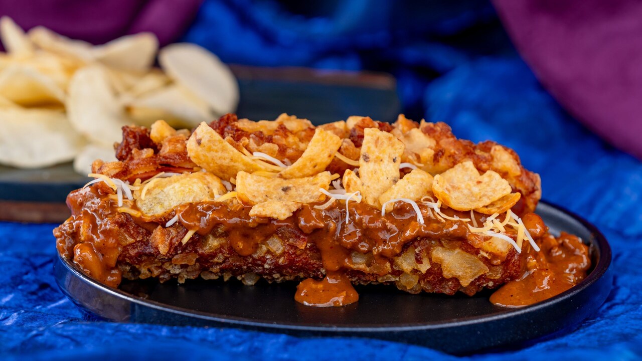Corn dog cubierto con chile, queso cheddar rallado y totopos de elote.
