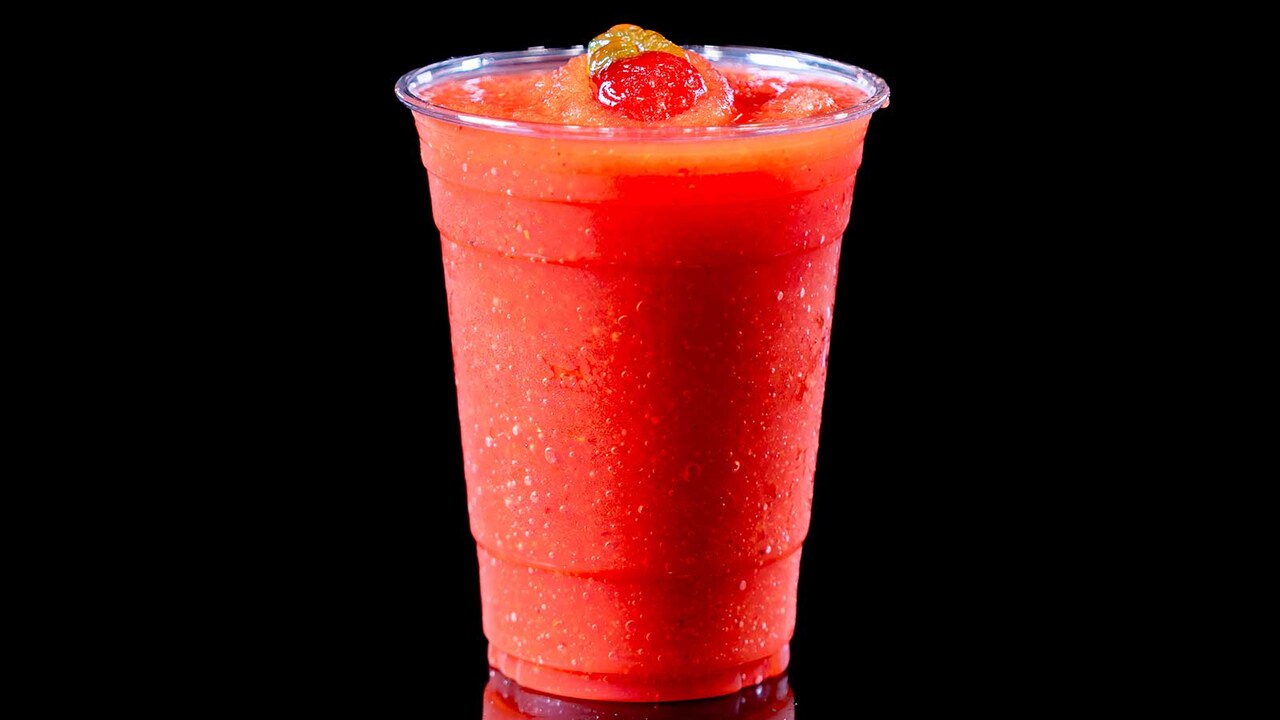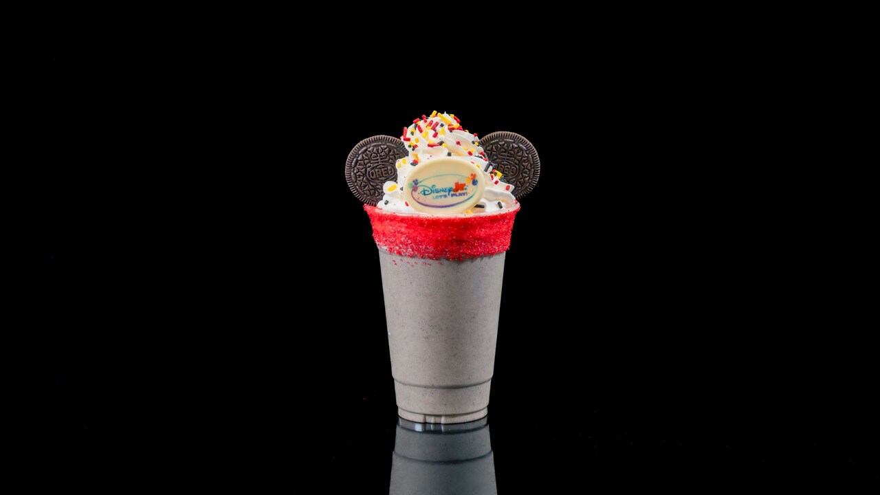 Malteada de galletas y crema de menta cubierta con crema batida, chispas, galletas de chocolate rellenas de crema y un borde de azúcar rojo