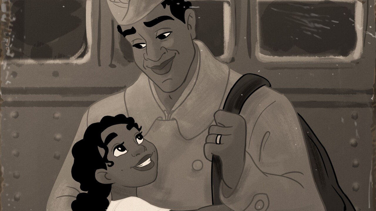 Descubre la historia del padre de la princesa Tiana, un veterano de la Primera Guerra Mundial, en la fila de Tiana's Bayou Adventure.