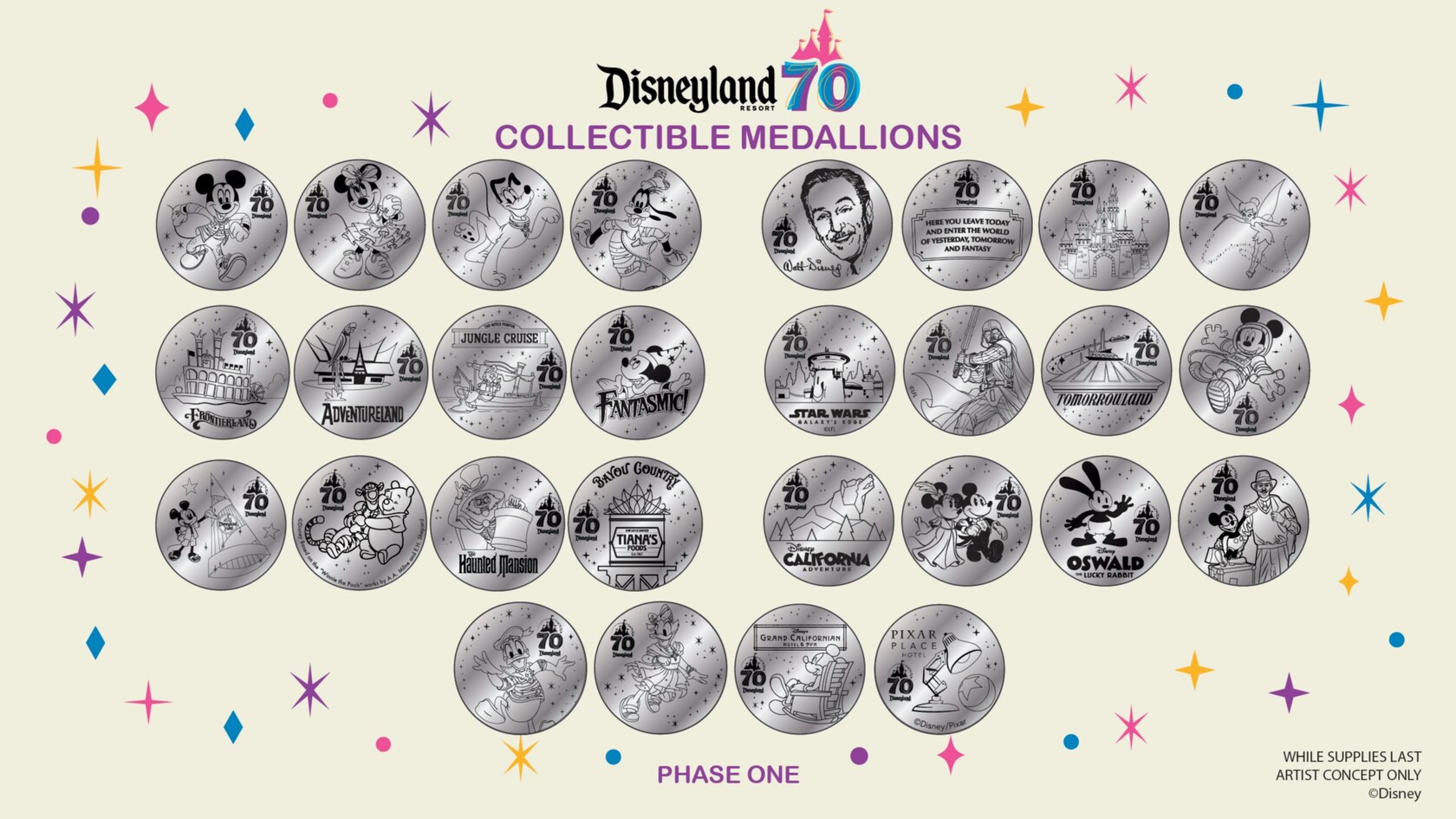 Revive tus recuerdos más felices con un juego de medallones coleccionables que conmemora la Celebración del 70.º Aniversario del Disneyland Resort.